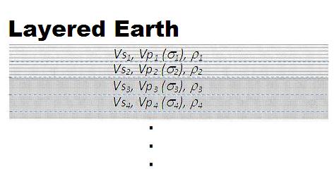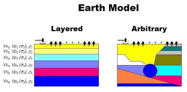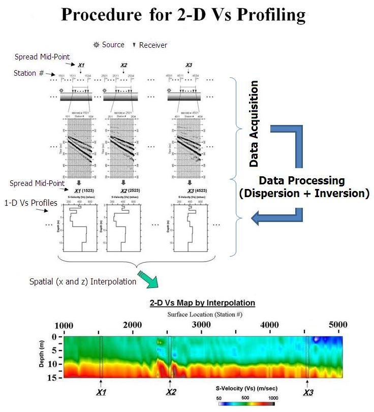 It is the 1D (depth) variation that is found for the Vs structure because the measured curve is most sensitive to the vertical variation of Vs and lateral variation is largely averaged off during data processing. This type of 1D Vs model is often referred as a layered earth model, which may include Vs, Vp, and rho all together or simply Vs alone with others fixed. A layered earth model inevitably carries no lateral variation as the case with an arbitrary earth model (Fig. 4). This means the surface wave method gives the 1D Vs structure (also called profile) most representative of the subsurface materials below the receiver spread by approximating them as a layered earth model despite the fact that, in reality, a certain degree of lateral variation always exists. Because of the nature of multichannel processing, it is usually the center location of the receiver spread to which this 1D Vs profile is assigned as the most representative surface location if the coordinate information is necessary. With accumulation of multiple number of this 1D Vs profile assigned with a unique surface coordinate, a 2D Vs profile is constructed by using an appropriate spatial interpolation scheme.