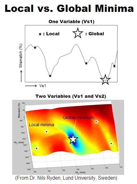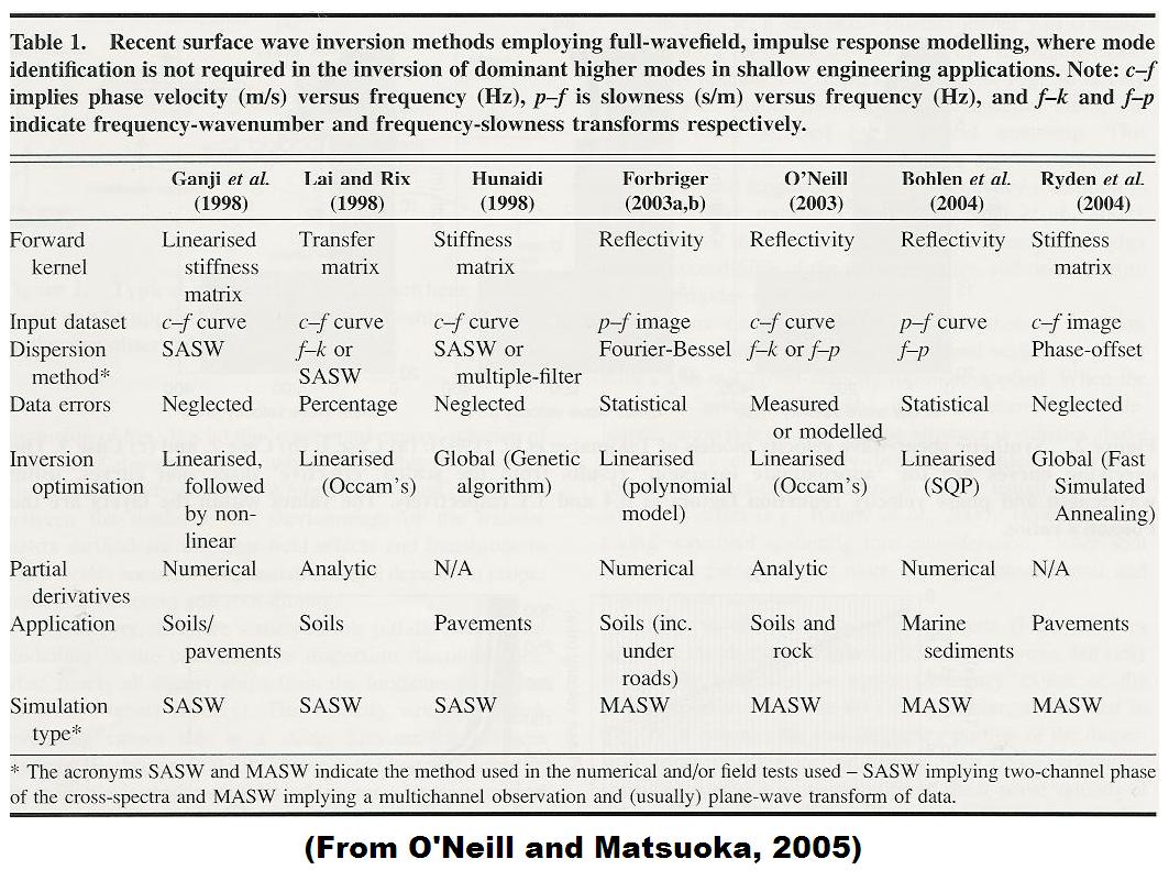 The special edition in 2005 on the surface wave method published by the Journal of Environmental and Engineering Geophysics (JEEG) presents a summary table of typical inversion approaches adopted in both the two-receiver (SASW) and the multichannel (MASW) methods. Regardless of any specific type used, the surface wave inversion is non-unique and non-linear problem to varying extent under different circumstances. In addition, it is not guaranteed if a final solution indeed represents the global minimum instead of one of the local minima.