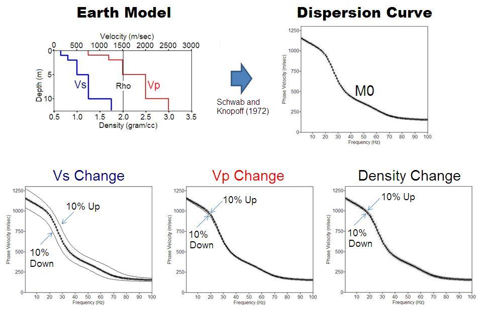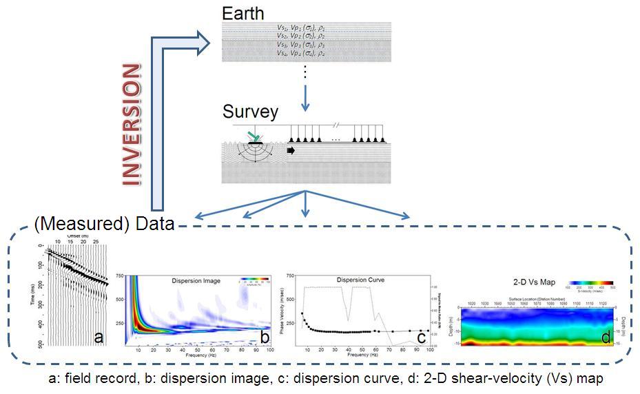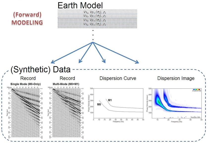 Historically, the inversion of surface waves has meant an estimation of the earth’s properties from the measured surface wave data (Fig. 1). It is the earth’s elastic property that is estimated among many properties—electric and magnetic to name a few. Various types of surface wave data can be used for the estimation that may include raw field record, dispersion image, dispersion curve(s), and a preliminary 2D shear(S)-wave velocity (Vs) map (see different inversion approaches listed below). Regardless of the type of data used, the surface wave inversion cannot be solved directly, requiring an optimization technique to find the most probable solution in a pool of infinite candidates. This technique can be a deterministic approach, random, or combination of both. On the other hand, the forward modeling (Fig. 2) of surface wave phenomena is usually a unique problem.