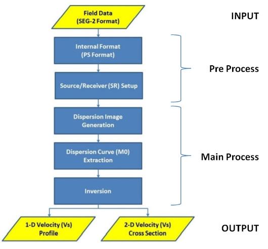 Data analysis starts with input seismic field files (also called records) usually in SEG-2 format, which is an engineering standard. The entire steps can be divided into pre- and main- process steps as illustrated by a generalized flowchart on the right.