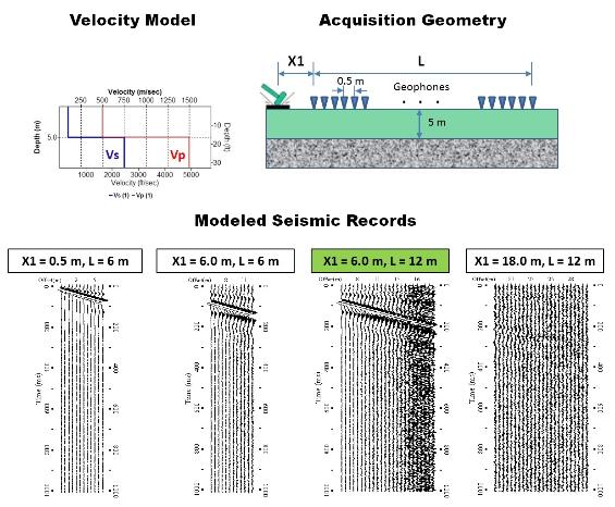 geometry displayed in the figure shows a 0.5-m receiver spacing (dx = 0.5 m) used for all modeling outputs (Figure 1). This means different number of