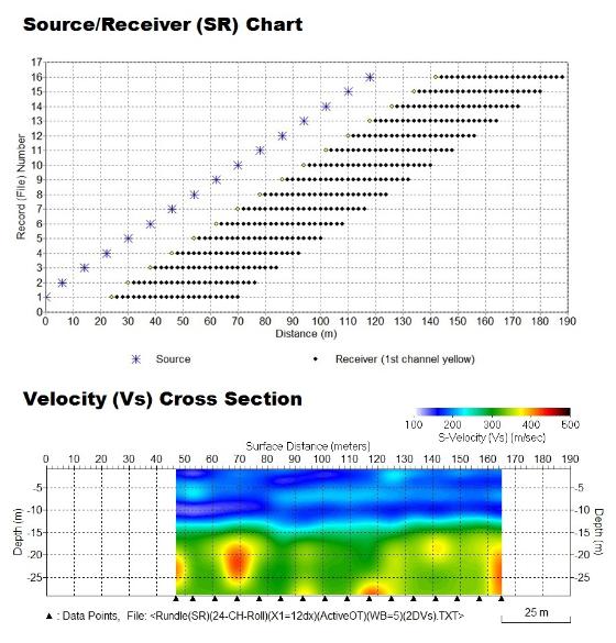 of the survey was to characterize stiffness of ground materials for top 25-m depth range. A 24-channel land streamer of 2-m spacing (dx = 2 m) with